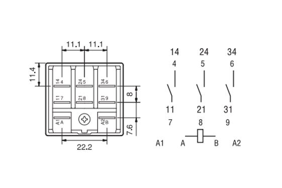 RELEVADOR INDUSTRIAL CON MONTAJE EN ZÓCALO CON ALETAS DE FIJACIÓN, 8 PINES TIPO FASTON 250, 16A ⇒ TENSIÓN NOMINAL DE LA BOBINA: 230 VAC ⇒ TENSIÓN NOMINAL EN CONTACTOS: 250 VAC ⇒ CORRIENTE NOMINAL: 16A ⇒ CONFIGURACIÓN: 3 NA (≥ 3 mm*)